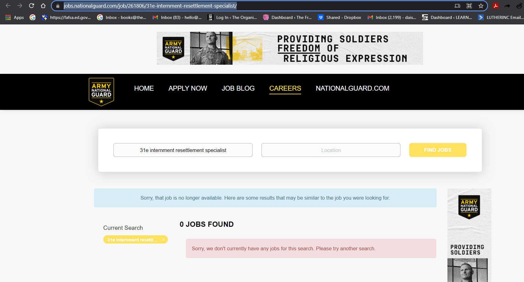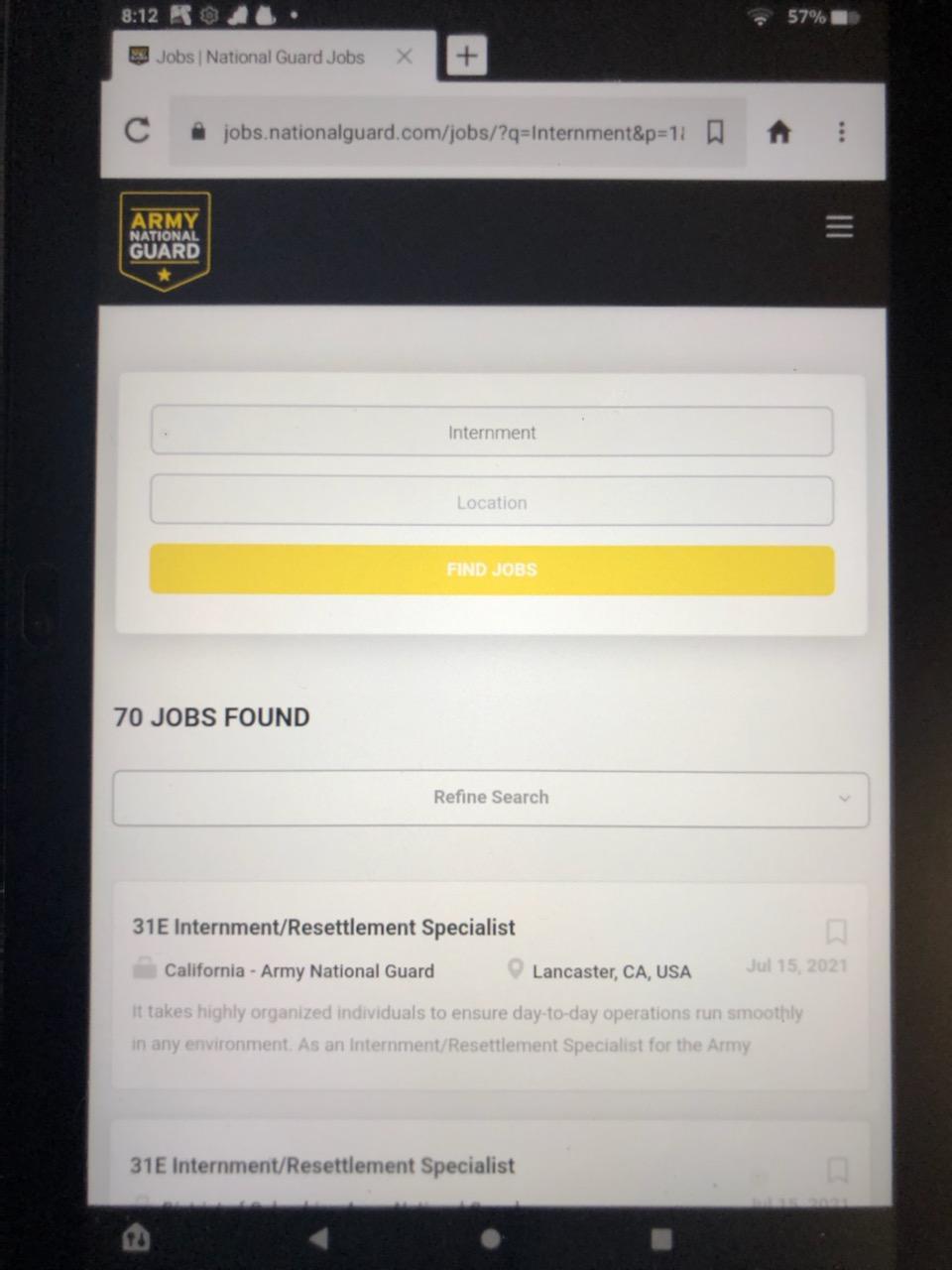 Either the National Guard very quickly filled those positions, or someone is attempting to hide something. The links now all state: ZERO JOBS FOUND. Below is a screenshot of the listing for Lancaster, Ca. when it was still available.